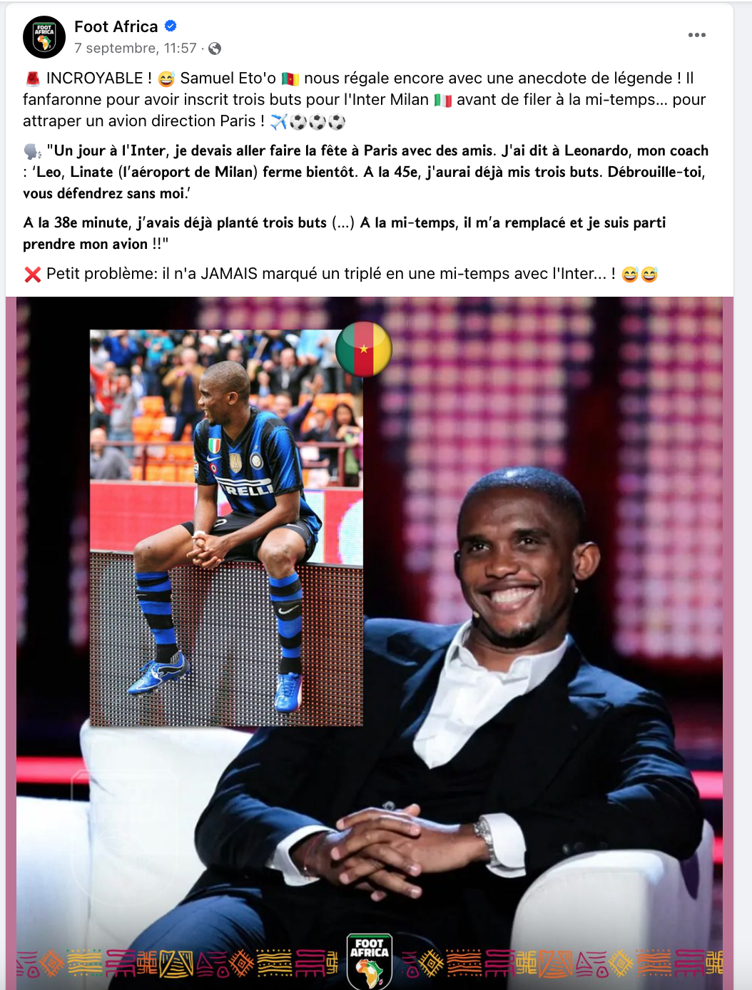 Faux, Samuel Eto’o n’a jamais marqué un triplé en une mi-temps avec l’Inter Milan