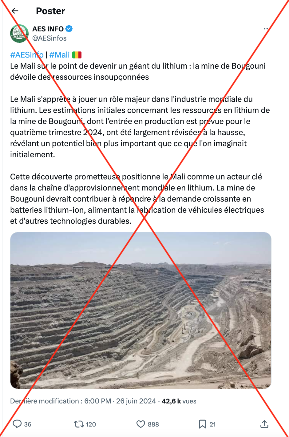 Mali : Cette illustration ne correspond pas à la mine de lithium de Bougouni, c’est une affirmation trompeuse.