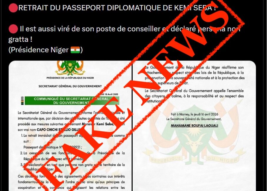 Mais il s’agit d’une fausse information car aucune communication officielle de la Présidence de la République du Niger, ni aucune source crédible, n’a confirmé une telle décision.