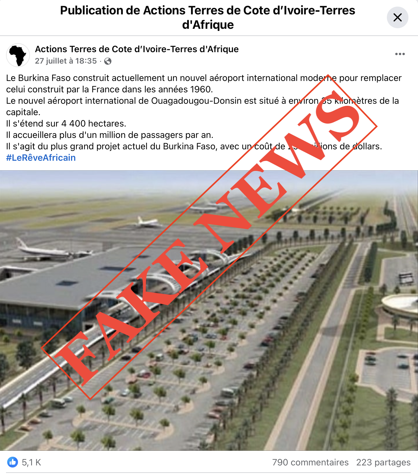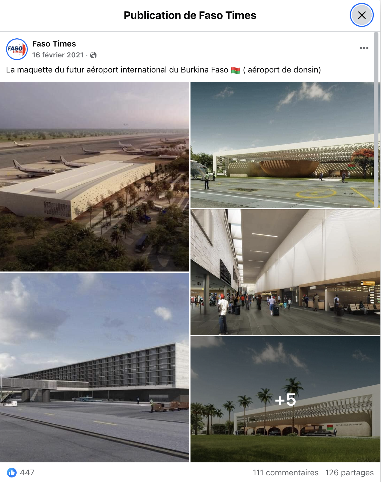 Depuis quelques jours, une publication largement partagée sur les réseaux sociaux, dont Facebook, prétend montrer un aéroport international Ouagadougou-Donsin en construction pour « remplacer celui construit par la France dans les années 1960 » au Burkina Faso, mais ce n’est pas le cas. Nous vous expliquons.