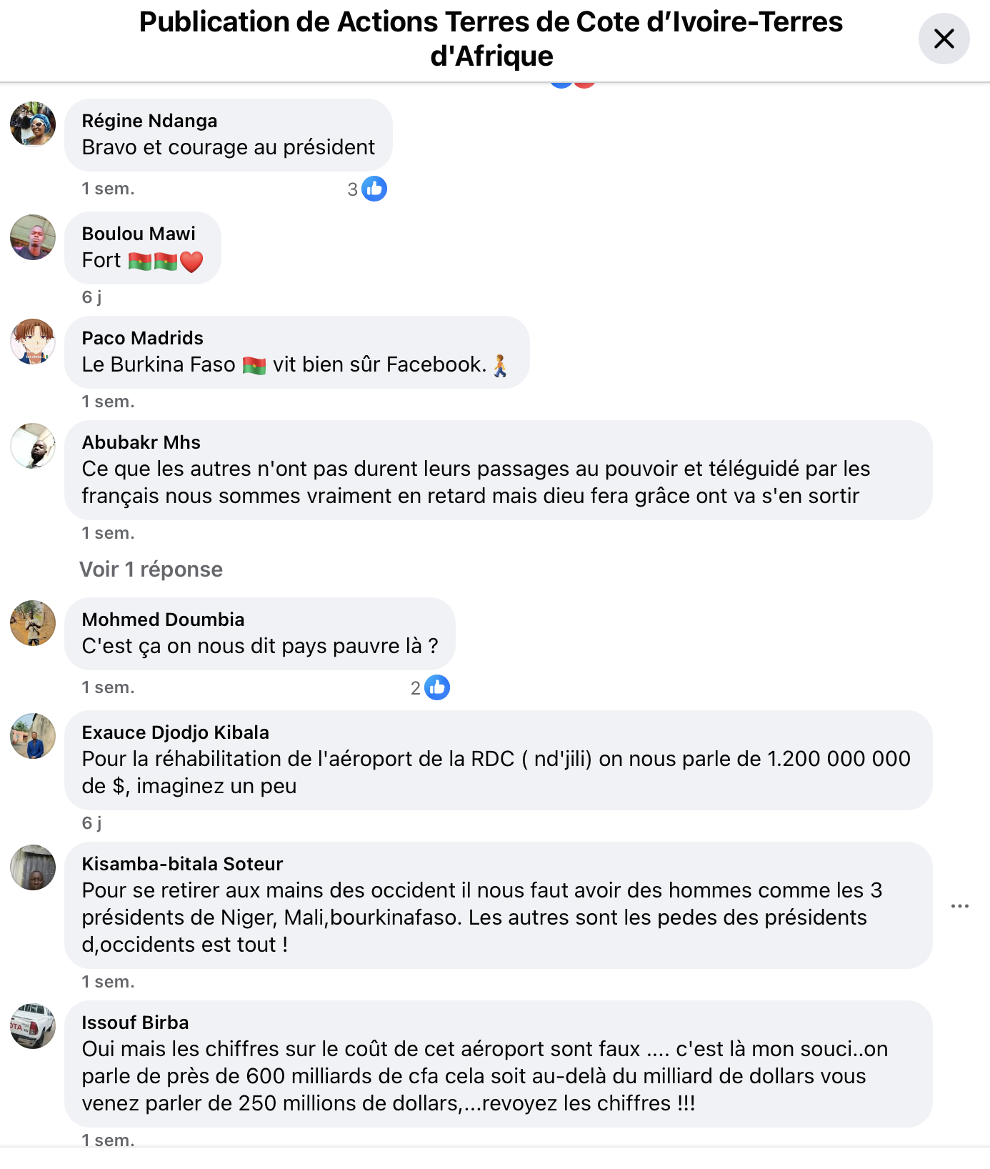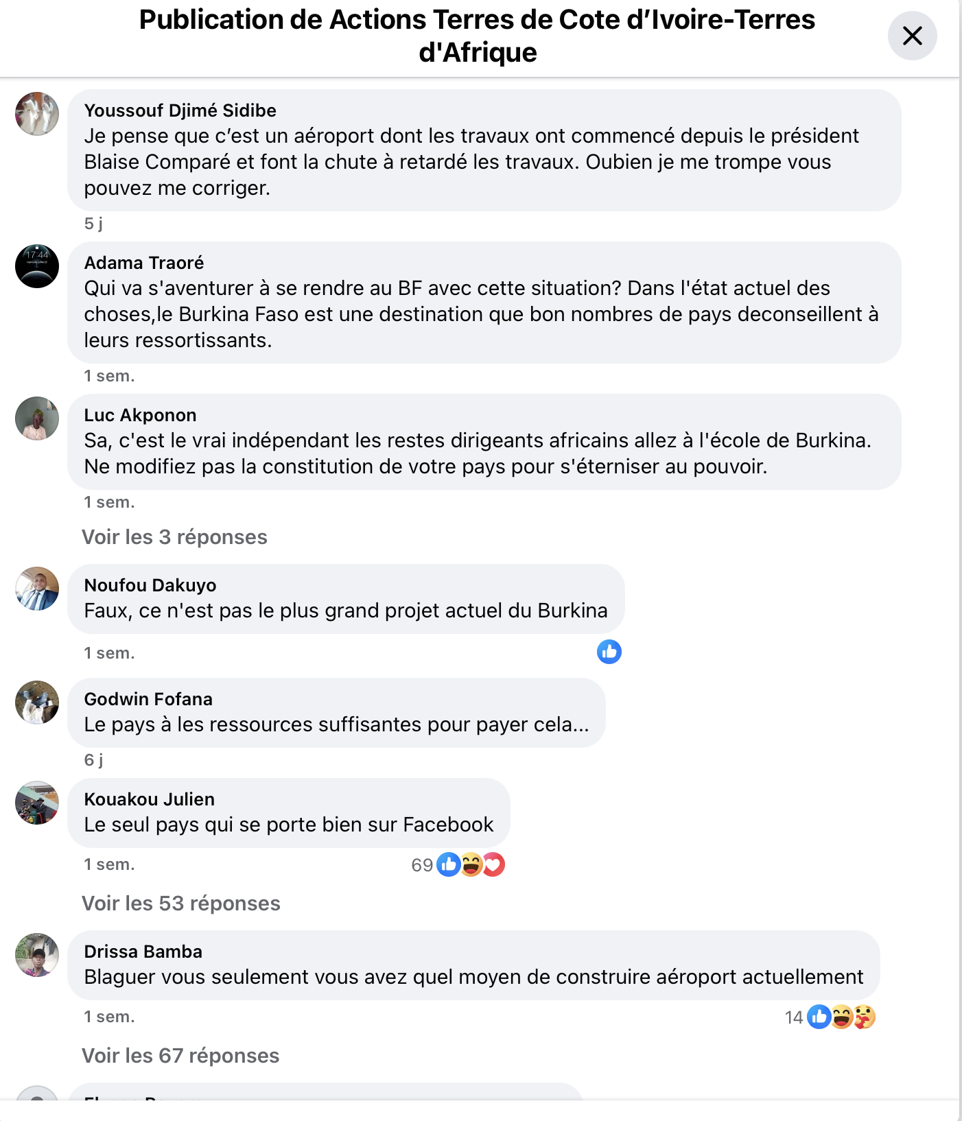Le post (lien archivé ici) publié le 27 juillet 2025 sur le réseau social Facebook par Actions Terres de Côte d’Ivoire-Terres d’Afrique porte la légende suivante : « Le Burkina Faso construit actuellement un nouvel aéroport international moderne pour remplacer celui construit par la France dans les années 1960… Qu’il s’agit du plus grand projet actuel du Burkina Faso, avec un coût de 250 millions de dollars. ». La publication a recueilli plus de 5000 likes en plus de plusieurs centaines de commentaires et de partages. Des utilisateurs félicitent le président burkinabè pour son leadership.