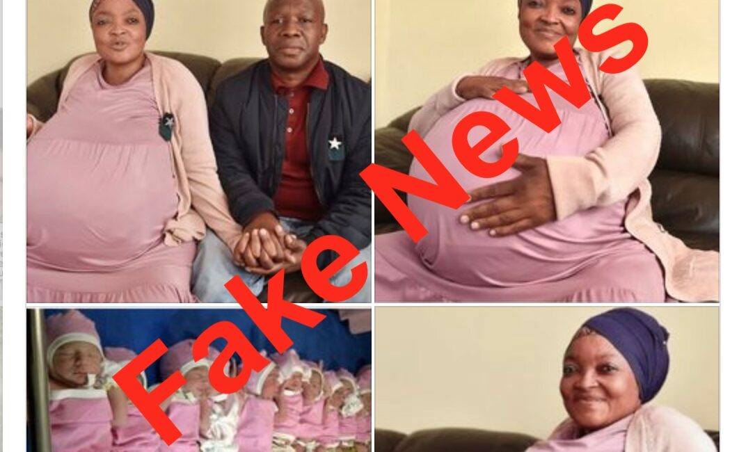 « Une sud-africaine de 37 ans après 10 ans sans enfants finit par accoucher de 10 enfants (7 Garçons 3 filles) … » C’est cette légende qui accompagne la photo de la dame. Les clichés montrent plusieurs nouveaux-nés, et une femme au ventre extrêmement gonflé, assise aux côtés d’un homme. La publication prétend montrer « la première personne à mettre monde des décuplés. » Elle aurait ainsi battu le record Guiness établi par Halima CISSE, la Malienne qui a donné naissance à un nonuplé dans un hôpital du Maroc au mois de Mai 2021.