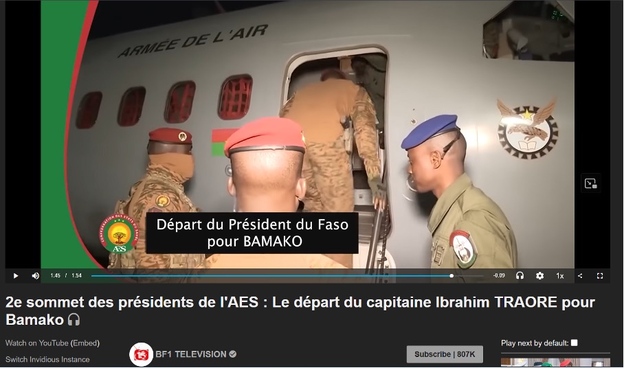 Par ailleurs, plusieurs médias crédibles confirment également que le président du Burkina Faso a rejoint ses homologues de l’AES par voie aérienne pour participer au sommet de l’organisation (1, 2, 3 et 4). Cette télévision burkinabé ‘’BF1 TÉLÉVISION montre le départ du capitaine Traoré dans un avion de l’Armée de l’air burkinabé pour Bamako.