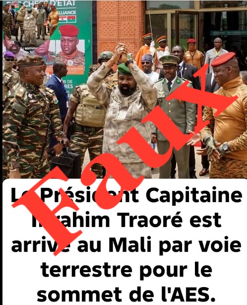 En marge du 2ᵉ Sommet du Collège des chefs d’État de l’Alliance des États du Sahel (AES) tenu à Bamako, plusieurs messages circulant sur les réseaux sociaux, notamment sur Facebook, prétendent que le président du Faso aurait « rejoint la capitale malienne par la voie terrestre (route) ». Mais, il s’agit en réalité d’une fausse information.