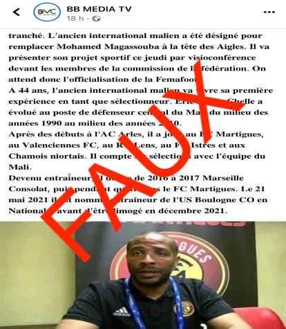 À titre d’illustration, on peut voir cette information largement partagée sur la page Facebook de BB MÉDIA TV où on peut lire : « L’ancien international malien a été désigné pour remplacer Mohamed Magassouba à la tête des aigles. » Voici la dite publication en image.