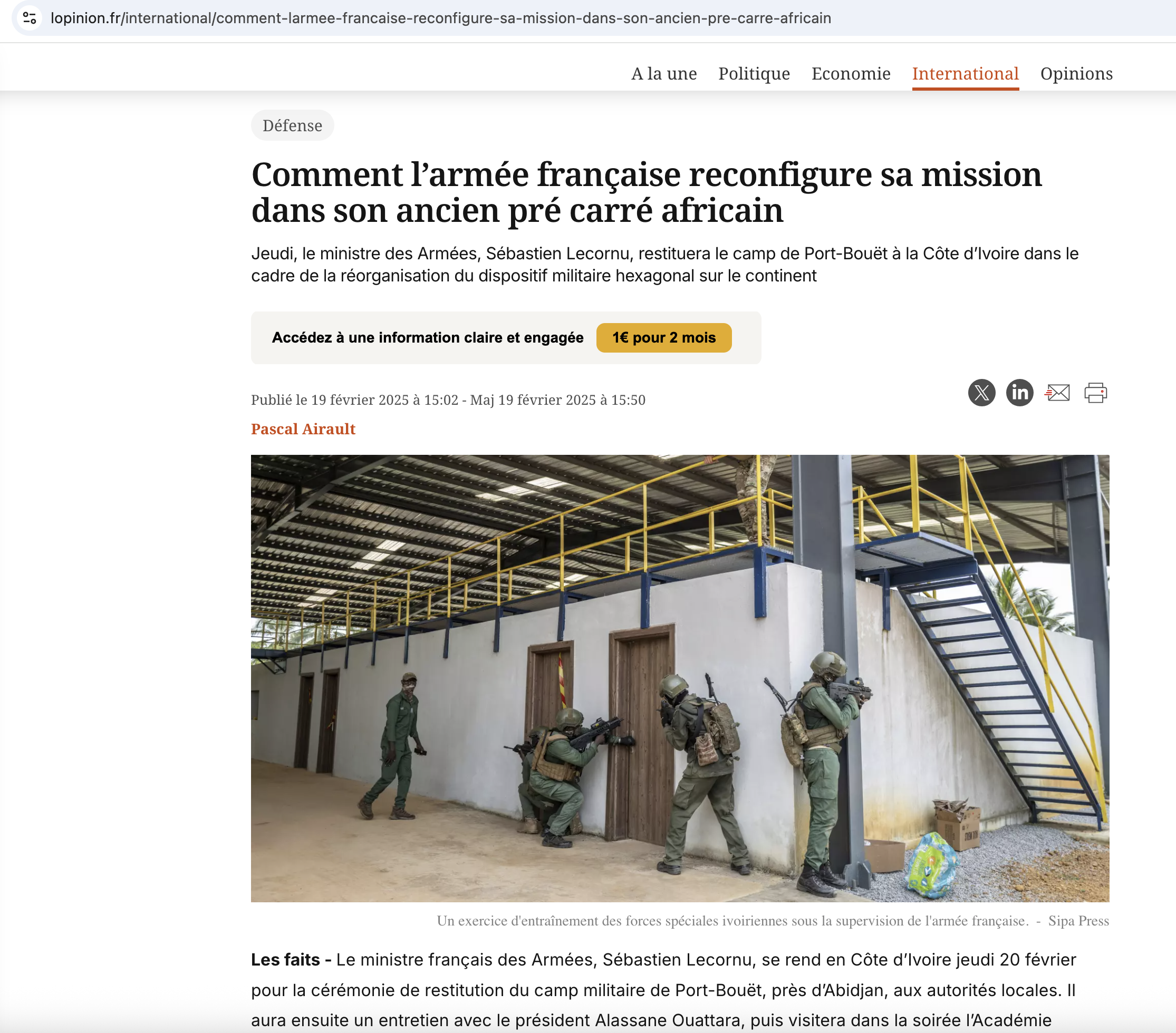 Nous avons effectué une recherche d’images inversée. Les résultats révèlent que la vidéo originale a été publiée pour la première fois le 21 février 2025 sur le compte Instagram du ministre français des Armées, M. Sébastien Lecornu. Elle a été prise lors de sa visite du 20 février à l’Académie internationale de lutte contre le terrorisme de Jacqueville en Côte d’Ivoire, accompagnée de son homologue ivoirien TENE BIRAHIMA Ouattara (lien archivé ici). Le ministre français des Armées était présent en Côte d’Ivoire à l’occasion de la cérémonie de restitution du camp militaire de Port-Bouët, près d’Abidjan, aux autorités ivoiriennes.