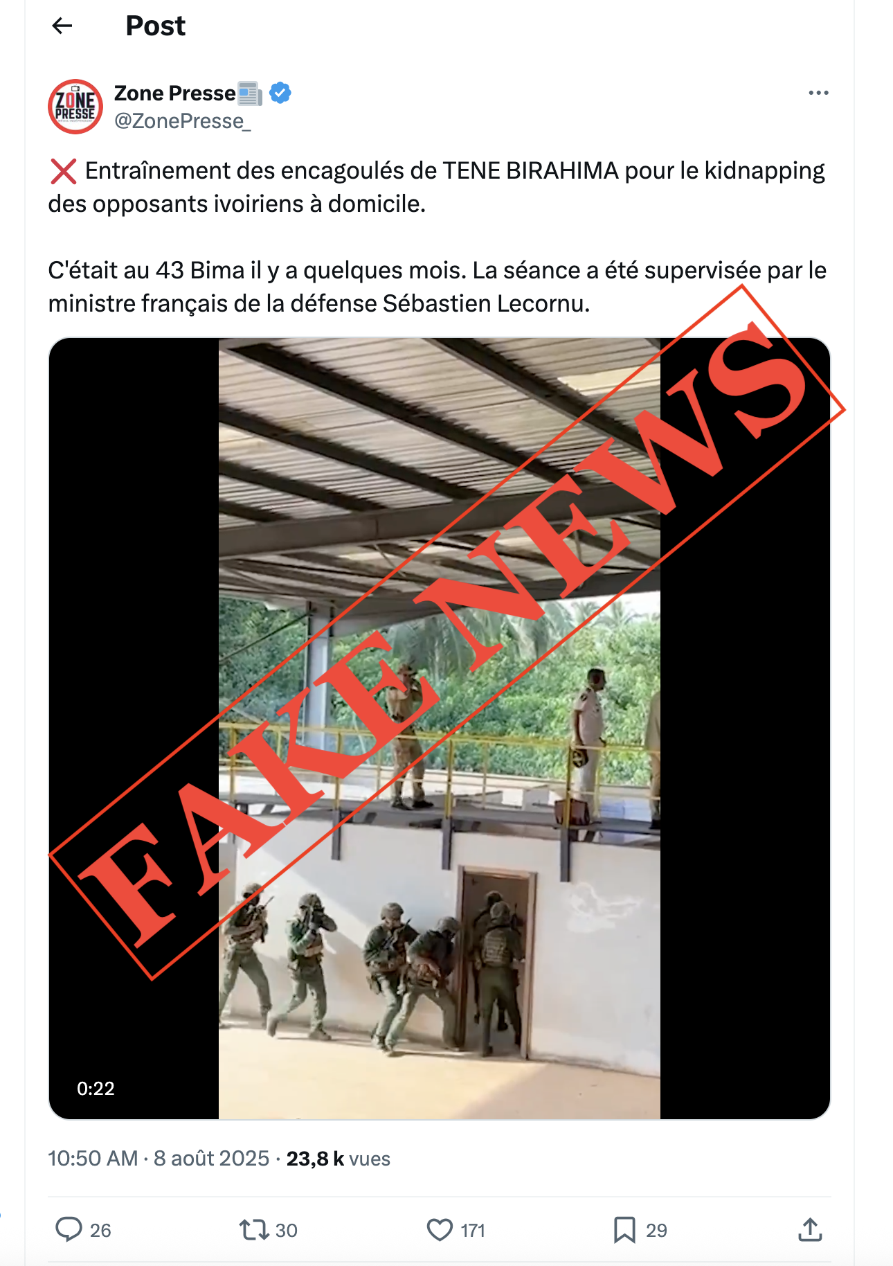 Le post (lien archivé ici) publié le 08 août 2025 sur le réseau social X par Zone Presse (@ZonePresse) porte la légende suivante : « Entraînement des encagoulés de TENE BIRAHIMA pour le kidnapping des opposants ivoiriens à domicile. C’était au 43ᵉ BIMA il y a quelques mois. La séance a été supervisée par le ministre français de la Défense Sébastien Lecornu. » La publication comporte la vidéo des soldats en uniforme en pleine démonstration avec des armes à feu. Elle a recueilli plus de 23 000 vues en plus de plusieurs centaines de commentaires et de partages.