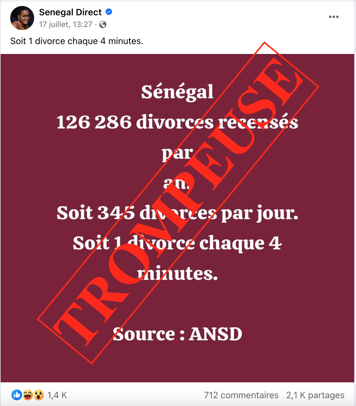 « Sénégal : 126 286 divorces recensés par an. Soit 345 divorces par jour. Soit 1 divorce chaque 4 minutes … Source : ANSD », publiée sur la page Facebook « Senegal Direct », suivie par plus de 738 000 personnes.