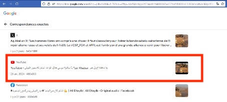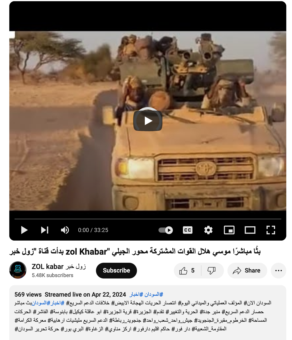 Nous avons donc procédé par une recherche d’image inversée dans Google Lens a permis de retrouver la vidéo publiée par une page YouTube  le 24 avril 2024 avec ce titre  traduit de l’arabe : « L’armée d’El Fasher, c’est des étincelles et du feu ». Cette page ‘‘ZOL kabar’’ est une « chaîne spécialisée dans la fourniture de contenus distinctifs en langue soudanaise abordant des questions sociales, des histoires patrimoniales et des histoires populaires » (lien archivé ici).
