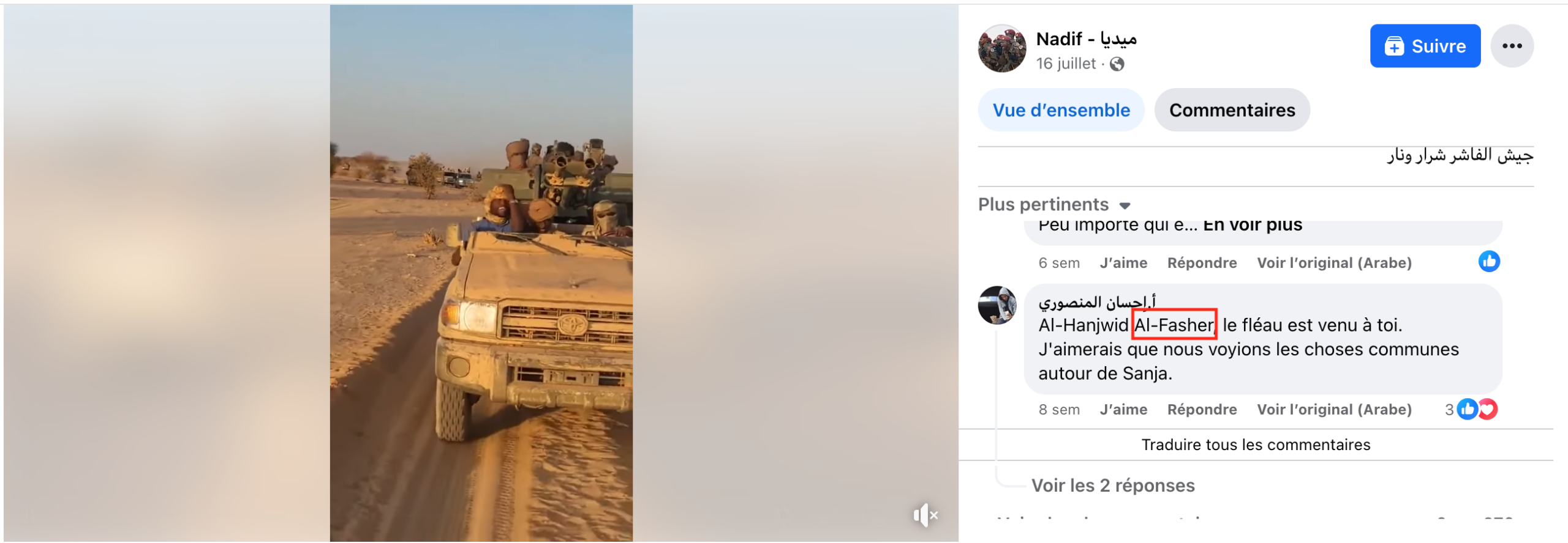 Nous avons aussi effectué une recherche (lien archivé ici) avec des mots clés «L’armée d’El Fasher, c’est des étincelles et du feu », qui nous a permis de retrouver les mêmes types de véhicules et hommes dans les combats intenses à El Fasher, au Soudan, 27 avril 2024. Cette ville stratégique est contrôlée par l’armée soudanaise et prise d’assauts par les Forces de soutien rapide (une force paramilitaire soudanaise). Les détails sont disponibles sur TV5 monde.