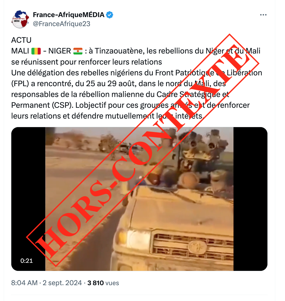 Le post (lien archivé ici) publié le 2 septembre 2024 sur le réseau social X (anciennement Twitter) porte la légende : « MALI – NIGER  : à Tinzaouatène, les rébellions du Niger et du Mali se réunissent pour renforcer leurs relations. Une délégation des rebelles nigériens du Front Patriotique de Libération (FPL) a rencontré, du 25 au 29 août, dans le nord du Mali, des responsables de la rébellion malienne du Cadre Stratégique et Permanent (CSP). L’objectif pour ces groupes armés est de renforcer leurs relations et défendre mutuellement leurs intérêts ». La publication comporte la vidéo des soldats en uniforme dans un véhicule militaire sur une route bâtie en terre jaune